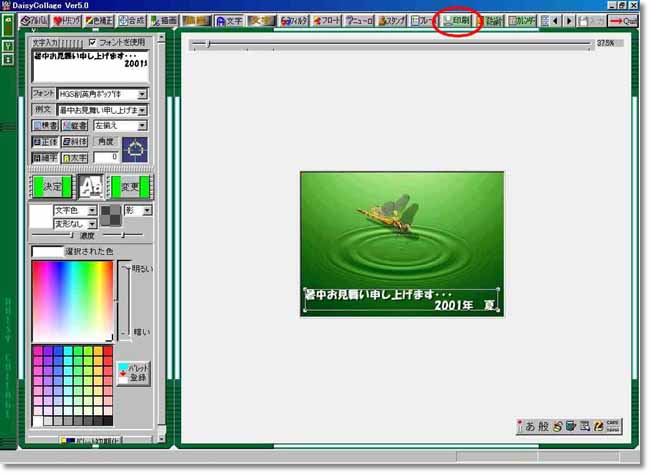 画面左上の[文字入力]ボックスを左クリックして、文章を入力して下さい。 次に表示する文字の[フォントの種類]、[色]などを調整します。 各設定が出来ましたら、[決定]ボタンを左クリックして下さい。 ※今回の設定内容のご案内 1) フォント・・・HGS創英角ポップ体 2) 文字の向きと位置・・・横書き・左揃え 3) 文字の状態・・・正体・細字 4) 文字の角度・・・0度 5) 文字の色・・・白 6) 文字の変形・・・なし 7) 文字の濃度・・・濃い(濃度バーの一番右端) 8) 影の色・・・黒 9) 影の濃度・・・中間(濃度バーの中央)