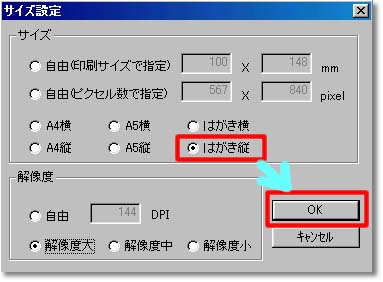 [サイズ設定]より[はがき縦(または横)]を左クリックして選択したら[OK]を左クリックします。