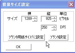 「プリンタの設定」ウインドウで設定したサイズを反映させます。[プリンタ用紙サイズに設定]ボタンをクリックして[サイズ](画像サイズ)の数値が変更されましたら、[OK]ボタンをクリックして下さい。