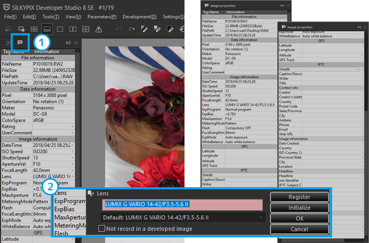 | 2 | Edit image properties | The image property information can be edited for some items. Edited information is added to the generated JPEG/TIFF image. |