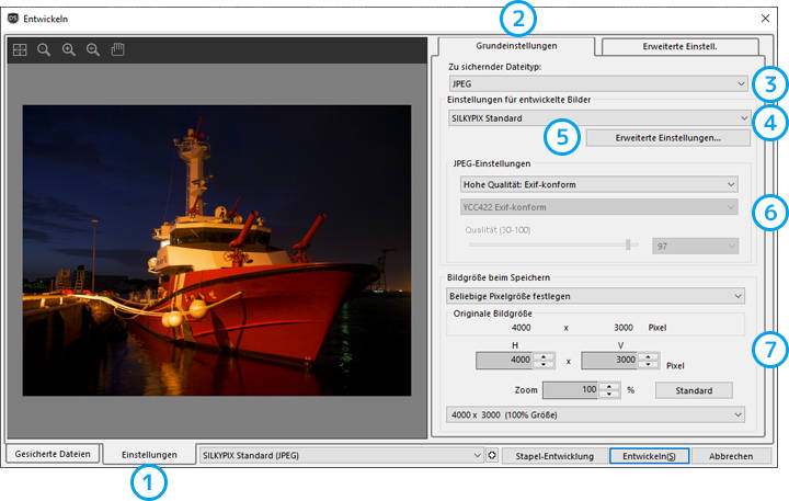 | 1 | JPEG-Einstellungen | Die Sorten bei der Umwandlung und dann Speichern in JPEG und die Kompressebilität wird eingestellt. |