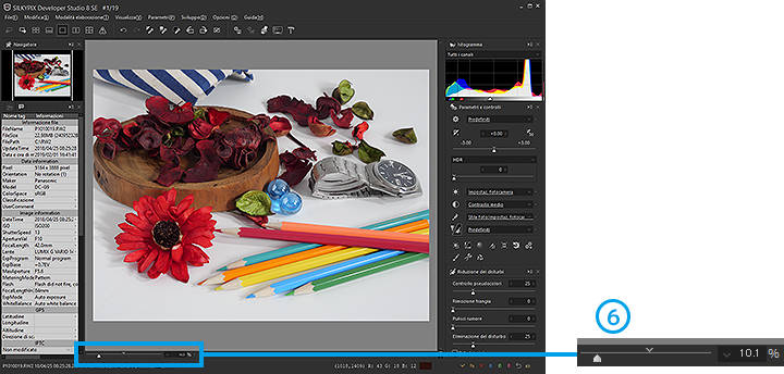 Mostra in grandi dimensioni l'immagine selezionata. Facendovi doppio clic la s'ingrandisce al 100%. Facendo doppio clic sull'immagine ingrandita al 100% la si adatta alle dimensioni della finestra. Le dimensioni dell'immagine sono regolabili altresì con il cursore "Ingrandimento della visualizzazione" (6):