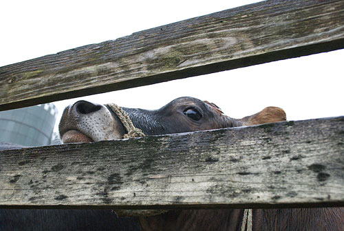 天気が今ひとつなせいか、開園間際なのかひと気の少ない朝の牧場をまきば線のある場所まで歩きます。キリッとしっとりとした空気が清々しい感じがします。一般的には牧場がメインなので途中には牛さんや山羊さん達がお出迎えしてくれました。来年は丑年なので年賀状用に長いまつげがかわいい牛さんの写真を少し撮りました。(写真1)