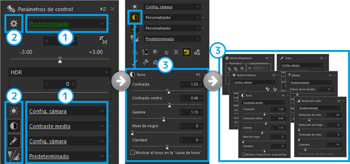Seleccionado los parámetros que han sido previamente registrados como 1. “Efectos” en los parámetros de control, sirve para hacer ajustes en la imagen. Para ajustes finos, haciendo clic en 2. “Ícono de parámetros”. se cambia cada una de las funciones en 3. “Pestaña de página”. En la pestaña de página se realiza los cambios finos utilizando principalmente el control deslizante.