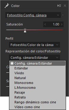 La configuración inicial por defecto es la configuración de Fotoestilo de la cámara. En caso de hacer la toma en modo RAW, sirve para cambiar el tipo de Fotoestilo que se puede configurar con la cámara.