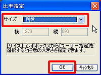 「比率指定」ウインドウが表示されます。領域選択枠の大きさは「サイズ」から指定します。